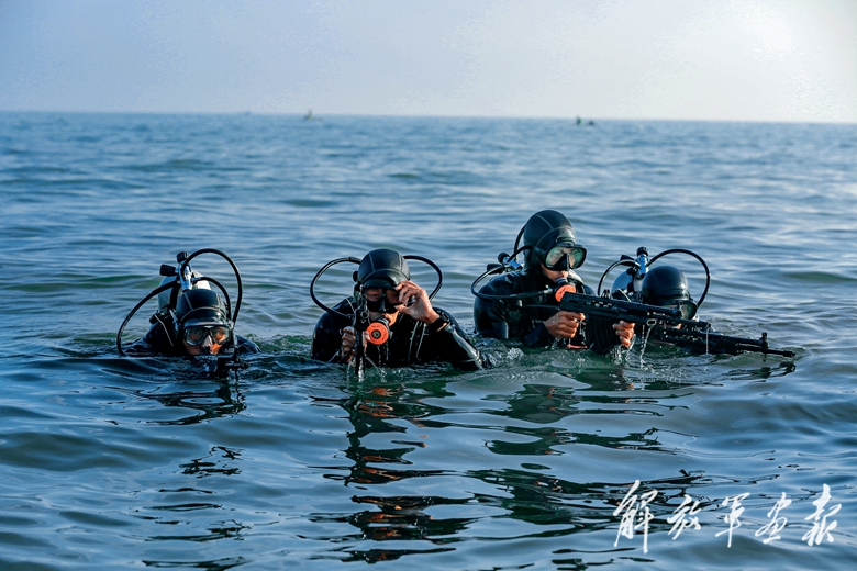 海軍陸戰(zhàn)隊組織破襲戰(zhàn)斗演練,錘煉提升蛙人潛水、搜索定位等技能。(攝影/田宇巍)
