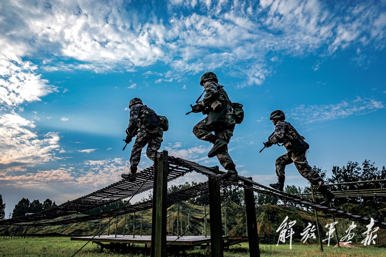 綜合應(yīng)急保障演練中,官兵開展通過軟橋訓(xùn)練。