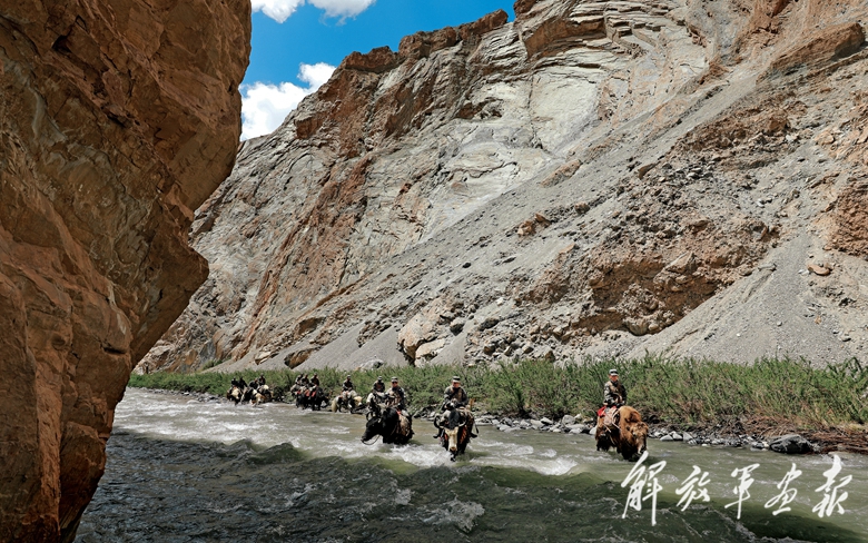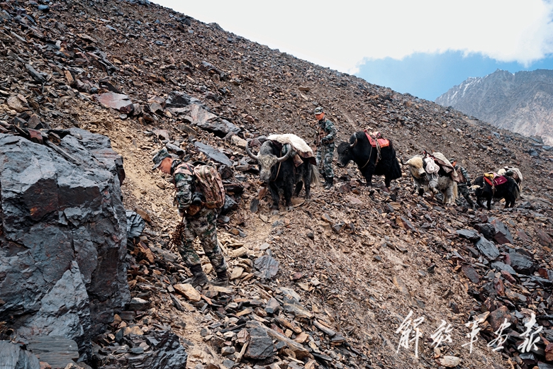隨著海拔不斷升高,氧氣越發(fā)稀薄,紫外線也變得越來越強烈。牦牛馱著官兵行進在陡峭的斜坡上,沉重的腳步踏過,碎石不斷滾落懸崖,發(fā)出的“嘩嘩”聲令人心悸?!跋蛏吓赖乃俣纫欢ㄒ仁^往下滑的速度快……”帶隊領(lǐng)導經(jīng)驗豐富,不斷提醒官兵注意安全。