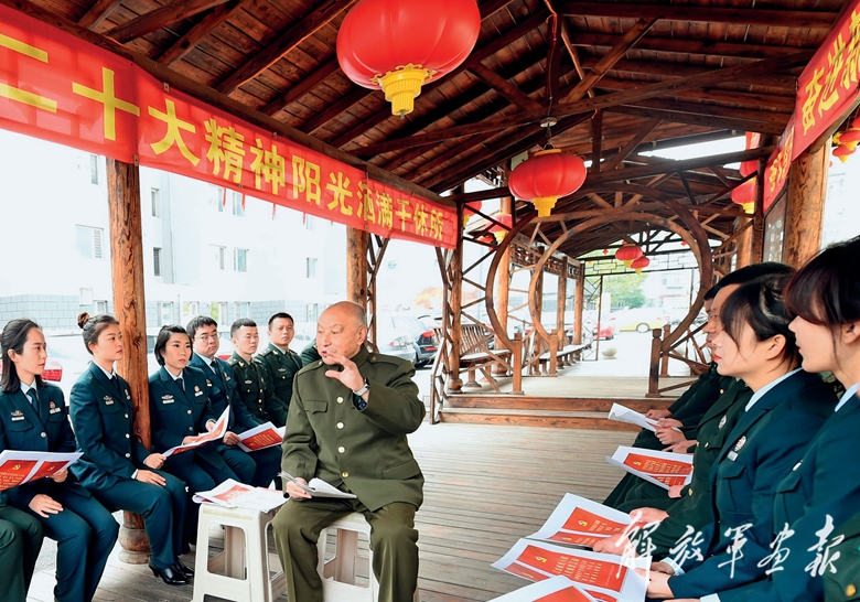 遼寧省軍區(qū)沈陽(yáng)第三、第四干休所開展學(xué)習(xí)宣傳貫徹黨的二十大精神共建共學(xué)活動(dòng),88歲高齡的老干部曾國(guó)興(中)與官兵、文職人員一齊分享學(xué)習(xí)心得體會(huì)。(攝影/譚長(zhǎng)俊)