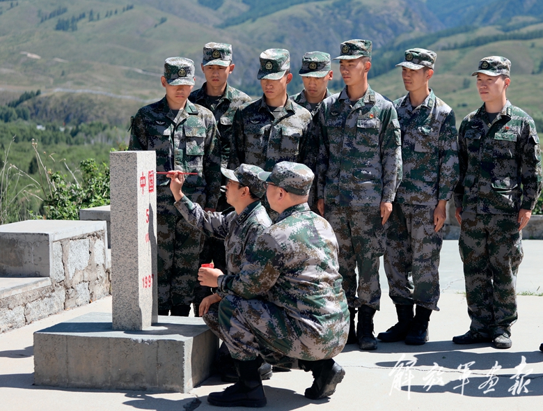 “星火”理論宣講服務(wù)政治教員群體深入邊關(guān)哨所進(jìn)行理論宣講。圖為群體成員在邊防線(xiàn)上為界碑描紅。