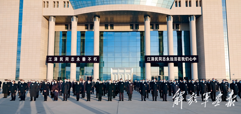 北京西郊機(jī)場(chǎng)國旗半垂,氣氛莊嚴(yán)肅穆,黑底白字橫幅上寫著:“江澤民同志永垂不朽”“江澤民同志永遠(yuǎn)活在我們心中”。習(xí)近平和夫人彭麗媛等胸佩白花、臂戴黑紗,神情凝重地在停機(jī)坪肅立。