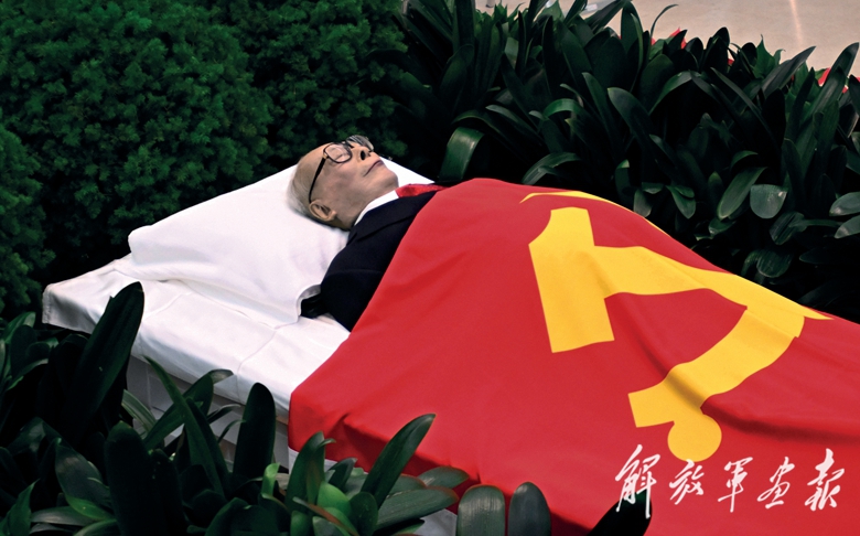12月5日,江澤民同志的遺體安臥在鮮花翠柏叢中,身上覆蓋著鮮紅的中國(guó)共產(chǎn)黨黨旗。(攝影/新華社記者 謝環(huán)馳)