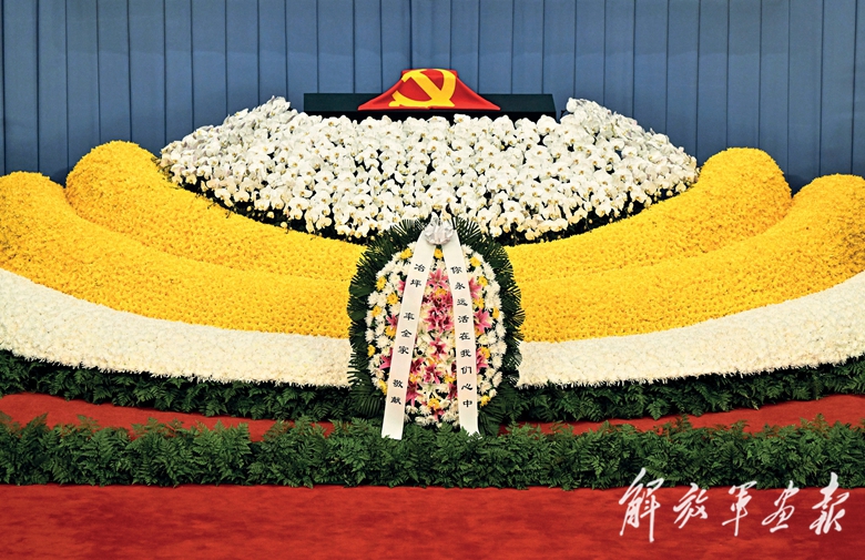 江澤民同志的骨灰盒安放在遺像前的鮮花翠柏叢中,骨灰盒上覆蓋著鮮紅的中國共產(chǎn)黨黨旗。江澤民同志的夫人王冶坪率全家敬獻(xiàn)的花籃擺放在江澤民同志的骨灰盒前。6名禮兵持槍肅立,守護(hù)在兩旁。(攝影/新華社記者 殷博古)