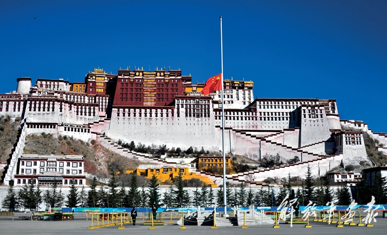 這是西藏拉薩布達(dá)拉宮廣場(chǎng)下半旗志哀。(攝影/新華社記者 張汝鋒)