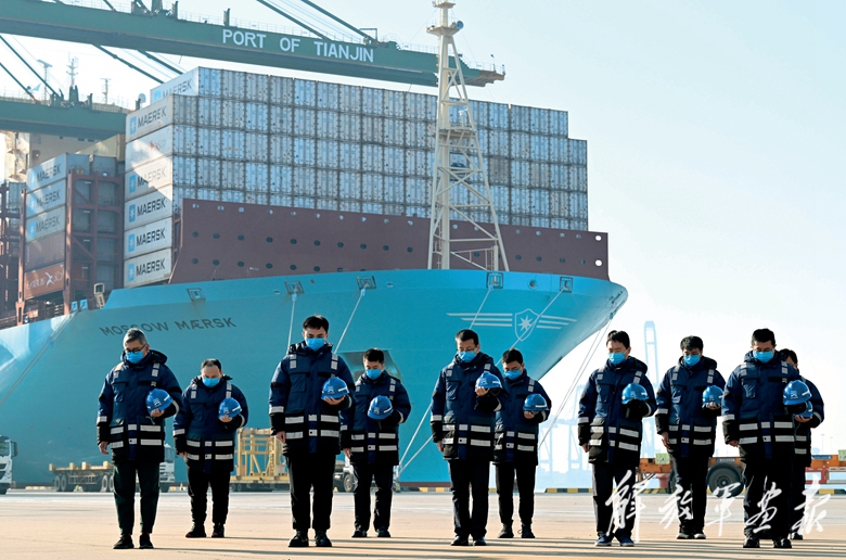 這是在天津港太平洋國(guó)際集裝箱碼頭,職工肅立默哀。(攝影/新華社記者 趙子碩)