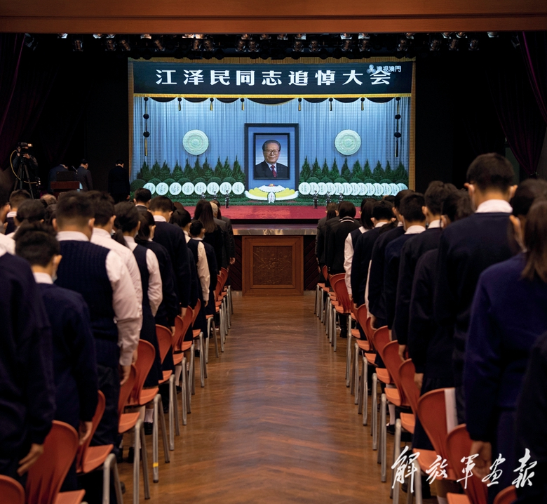 這是在澳門濠江中學(xué),師生肅立默哀。(攝影/新華社記者 張金加)