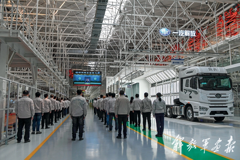 這是在吉林長(zhǎng)春的一汽解放工廠車間,工人們收看江澤民同志追悼大會(huì)直播。(攝影/新華社記者 張 楠)
