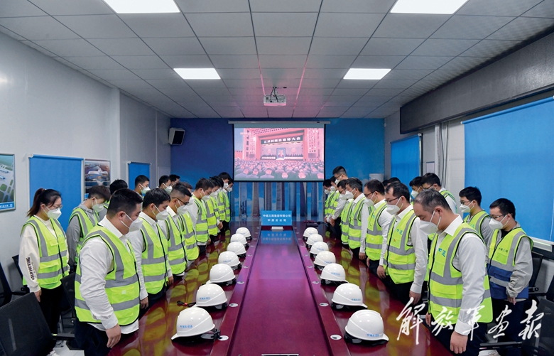 這是在河南鄭州中原數(shù)字產(chǎn)業(yè)園(西園)項(xiàng)目工地,中建三局的建設(shè)者肅立默哀。(攝影/新華社記者 李嘉南)