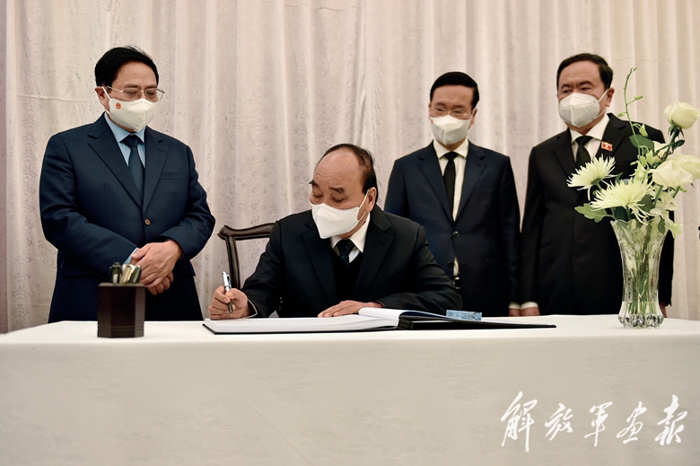 12月2日,越南國(guó)家主席阮春福(左二)、總理范明政(左一)等在中國(guó)駐越南大使館吊唁江澤民同志。(攝影/新華社記者 胡佳麗)