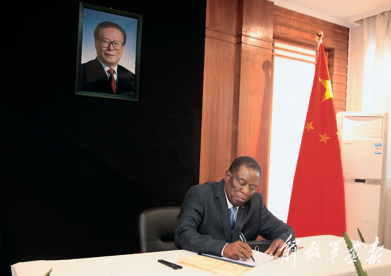 12月5日,津巴布韋總統(tǒng)姆南加古瓦在中國(guó)駐津巴布韋大使館吊唁江澤民同志。(攝影/肖恩·朱薩)