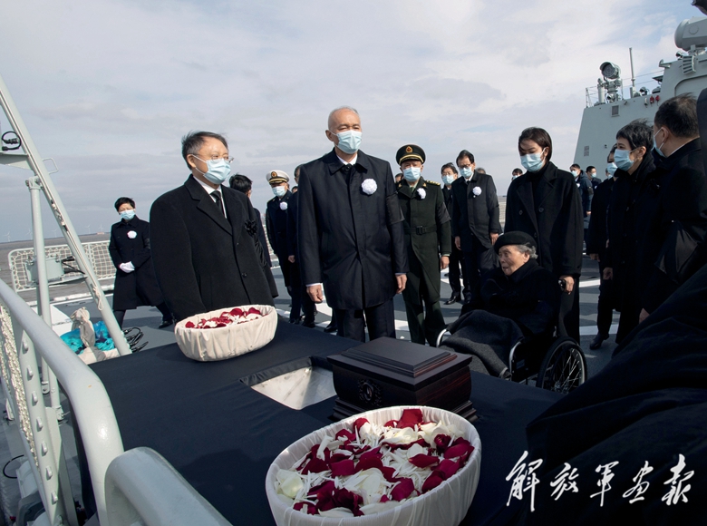 中午12時35分,揚州艦抵達長江入??谒?。在軍艦甲板上,送別的人們,肅立默哀。水天肅穆,波翻浪涌。蔡奇和江澤民同志的夫人王冶坪等親屬,眼含熱淚,強忍悲痛,將江澤民同志的骨灰和繽紛的花瓣一起緩緩撒向無垠的江海。
