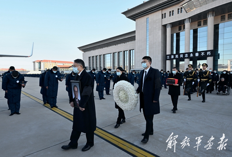 靈車緩緩駛?cè)胛鹘紮C場。松柏靜立,遠山靜默??哲姽俦嘘犆撁保克洼d護江澤民同志骨灰的專機起飛。專機盤旋著,在首都北京上空緩緩繞飛一周,告別這一江澤民同志為黨和國家事業(yè)傾盡心血的地方。