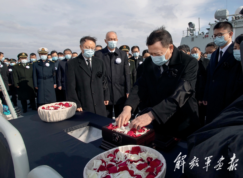 吳淞軍港碼頭,國旗半垂,莊嚴肅穆。黑底白字橫幅上寫著:“江澤民同志永垂不朽”“江澤民同志永遠活在我們心中”。海軍官兵整齊列隊,脫帽致禮。江澤民同志的親屬捧護著骨灰走下靈車,將骨灰安放在靈桌上。低回的哀樂聲中,送別的人們神情凝重,列隊肅立,深深鞠躬,向江澤民同志作最后的告別。