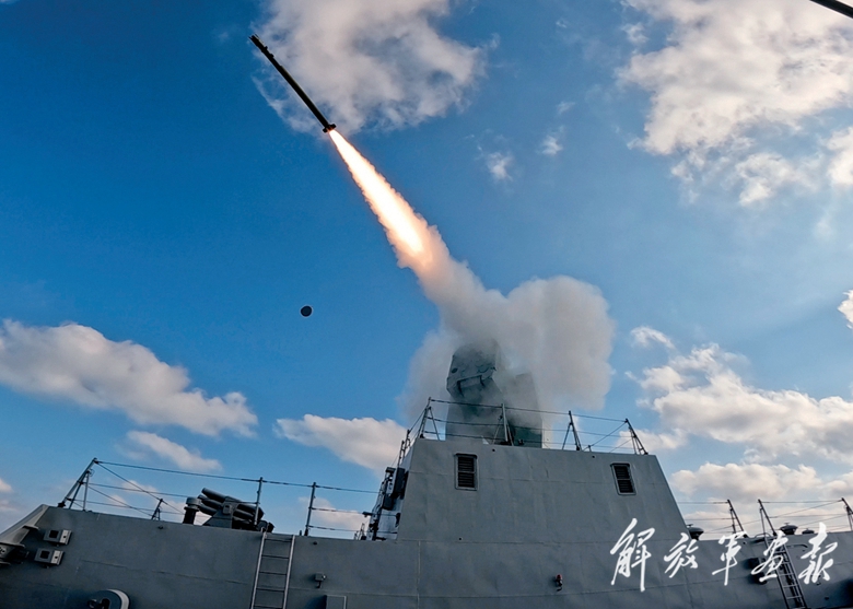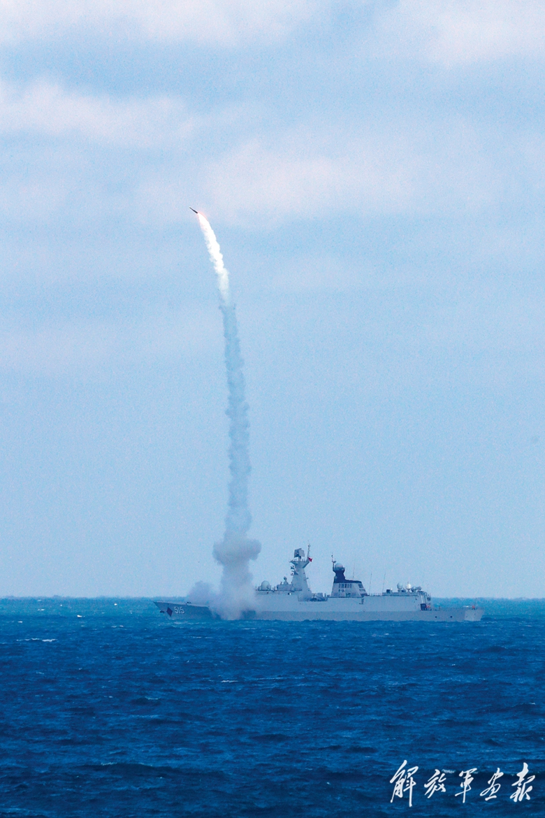 在東海某海域舉行的中俄“海上聯(lián)合-2022”聯(lián)合軍事演習(xí)聯(lián)合防空課目演練中,包頭艦實(shí)射防空導(dǎo)彈。