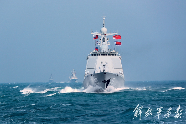 2022年12月21日,中俄“海上聯(lián)合-2022”聯(lián)合軍事演習(xí)在東海某海域開幕。圖為中方參演艦艇編隊(duì)破浪前行。