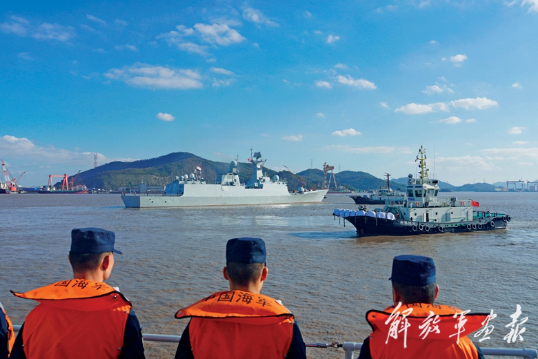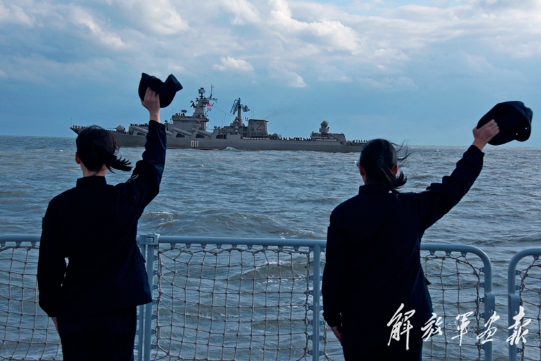 2022年12月27日,在東海某海域舉行的中俄“海上聯(lián)合-2022”聯(lián)合軍事演習(xí)結(jié)束,中國海軍濟(jì)南艦官兵列隊(duì)向俄艦揮手告別。