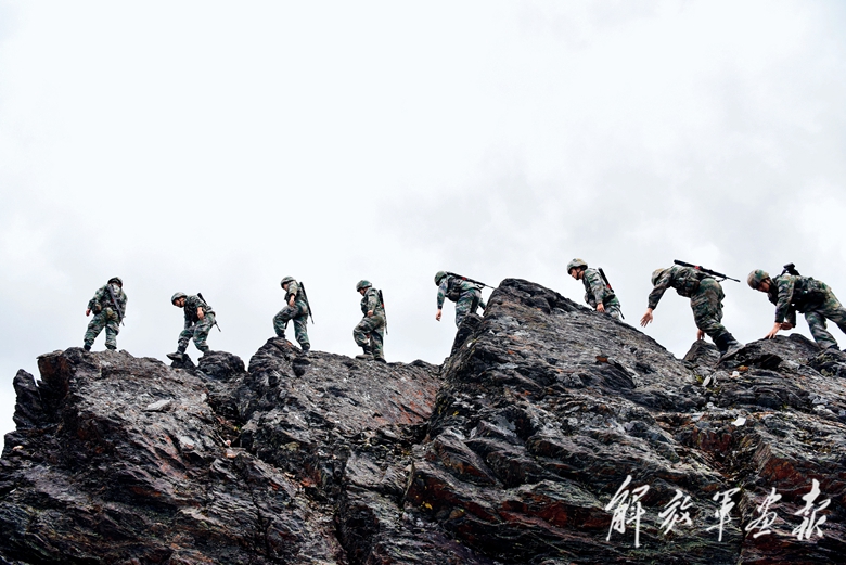巡邏途中,官兵翻越險(xiǎn)峰。