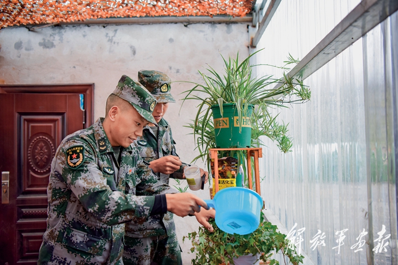 官兵利用業(yè)余時(shí)間為陽光棚里的綠植澆水施肥。