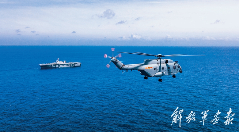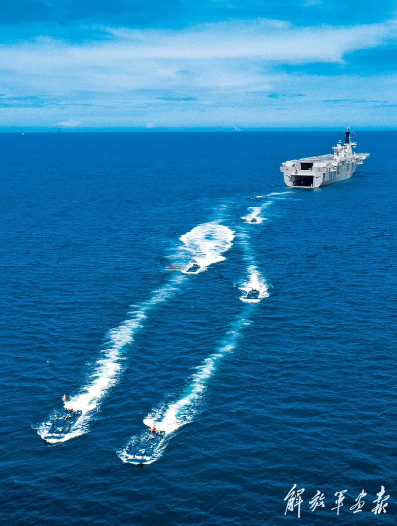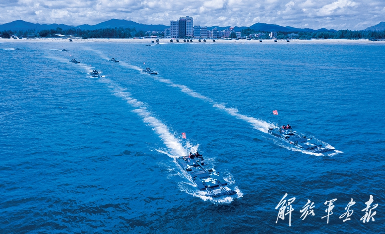 鐵甲踏浪,戰(zhàn)鷹轟鳴,海軍陸戰(zhàn)隊某旅一場立體攻防戰(zhàn)斗演練在陌生海域打響。在??栈鹆ρ谧o下,兩棲裝甲編隊有序駛離艦艇,快速向岸灘發(fā)起沖擊。