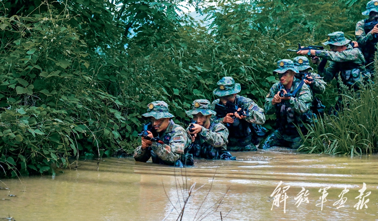 連續(xù)火力覆蓋后,“敵”兵力傷亡慘重。“各組注意,向‘?dāng)场v深發(fā)起沖擊!”戰(zhàn)斗進入白熱化,指揮員見時機成熟,迅速下達搶占要點指令。隨后,兩棲裝甲編隊通過岸上通路向縱深推進;數(shù)架直升機采取低空突防的方式抵近要塞,陸戰(zhàn)隊員快速索降;氣墊艇搭載全地形突擊車、輕型坦克突擊上陸;深入“敵后”的偵察小組發(fā)現(xiàn)“敵”指揮所后,迅即標記目標信息,通過某型信息終端引導(dǎo)炮兵實施火力摧毀……多兵力協(xié)同進攻,形成合圍態(tài)勢,成功奪占“敵”多個要點目標。