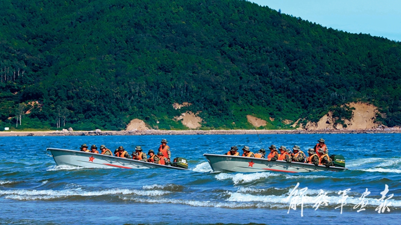 陸戰(zhàn)隊員搭乘沖鋒舟前出破障。