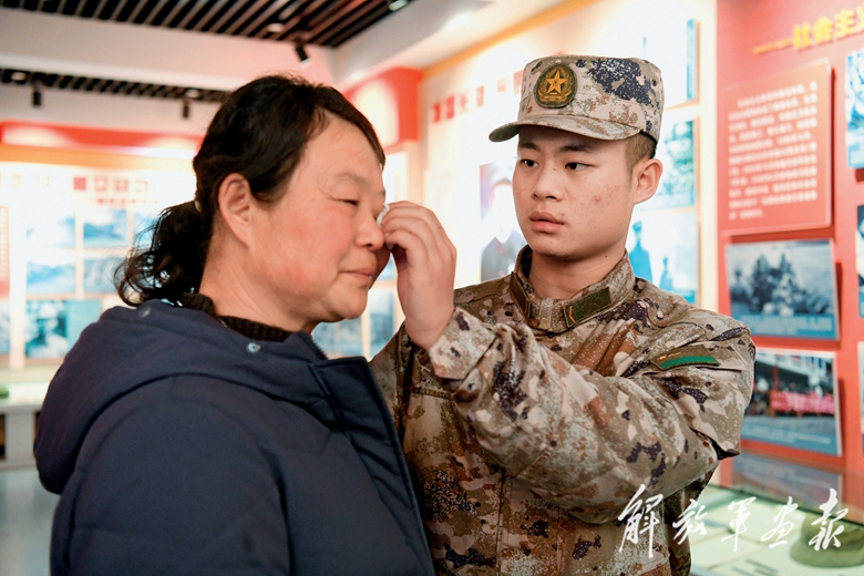 肖媽媽來到兒子肖榮基所在的部隊,內心感慨萬千,不禁流下淚水。肖榮基為母親擦拭眼淚。
