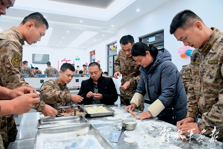 肖爸爸、肖媽媽和官兵一同包餃子。