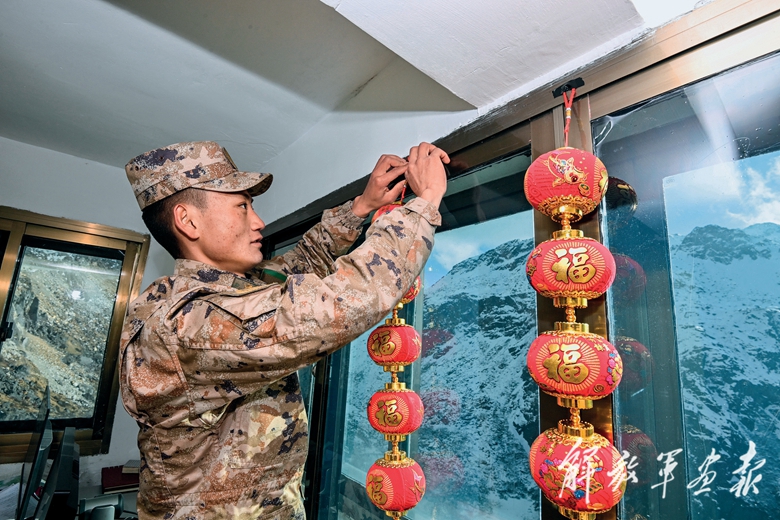 海拔4520米的西藏軍區(qū)無(wú)名湖哨所,戰(zhàn)士懸掛燈籠歡慶佳節(jié)。(攝影/龍 偉)