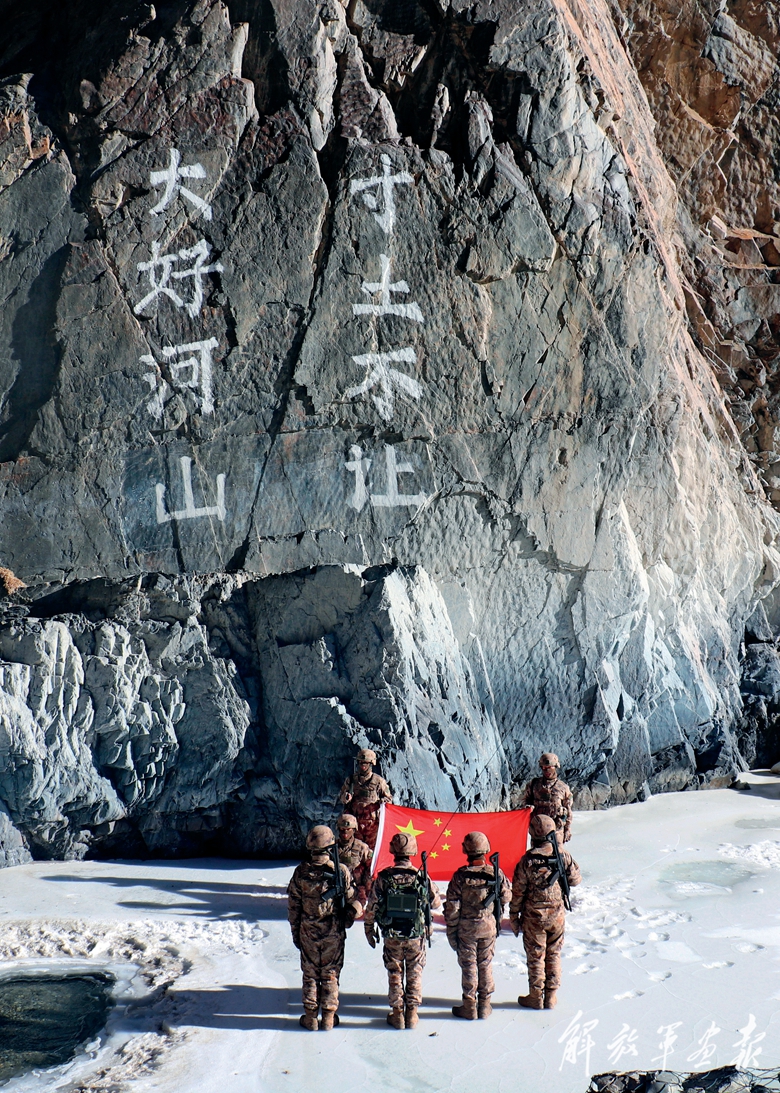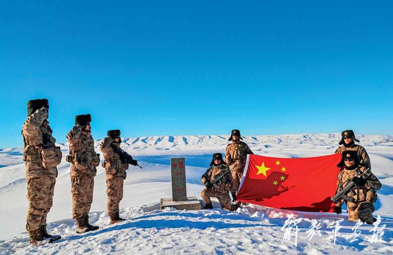 大年初一,新疆軍區(qū)某邊防團(tuán)官兵冒著-20℃的嚴(yán)寒在邊防線上巡邏執(zhí)勤。圖為官兵展開(kāi)國(guó)旗,宣示主權(quán)。 (攝影/記者 彭 亮)