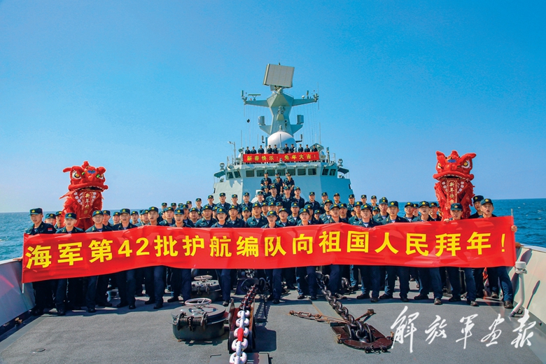 海軍第42批護(hù)航編隊(duì)在遠(yuǎn)海大洋向全國(guó)人民拜年。(攝影/馬玉彬)