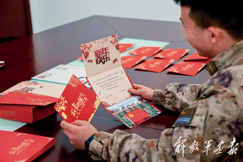 海軍航空兵某部中士姚關(guān)賽寫(xiě)給未婚妻的新年賀卡飽含深深的愛(ài)與思念。(攝影/朱 宇)