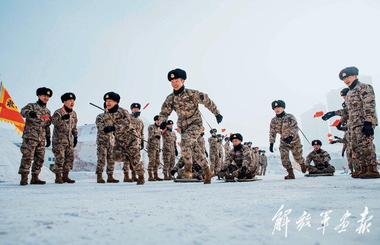 武警新疆總隊(duì)某支隊(duì)官兵踴躍參加冰上娛樂(lè)活動(dòng)。(攝影/余 博)