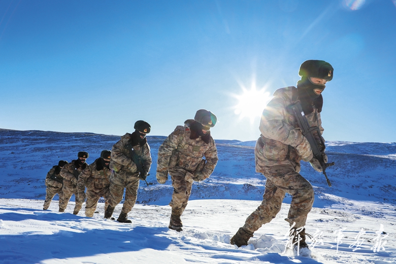 春節(jié)期間,新疆阿勒泰軍分區(qū)官兵在冰天雪地中執(zhí)勤巡邏,守衛(wèi)祖國(guó)邊防線。(攝影/段 偉)