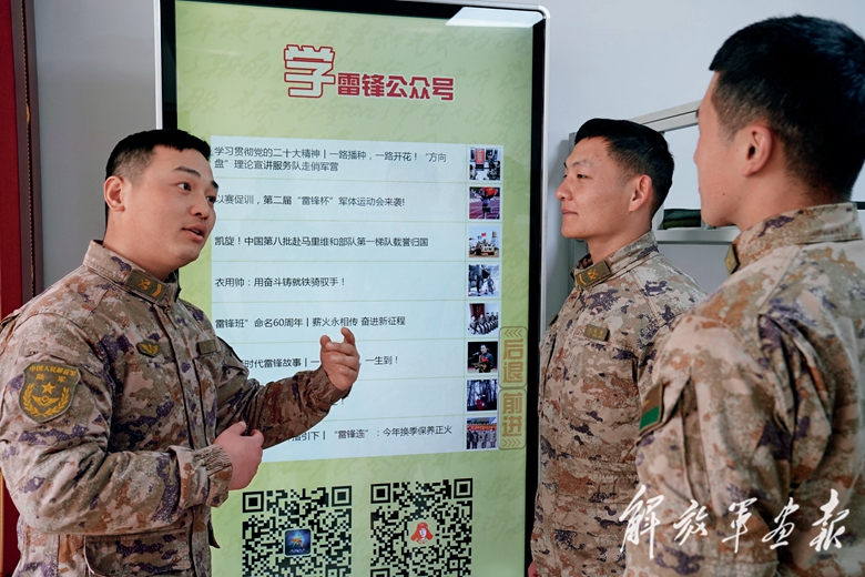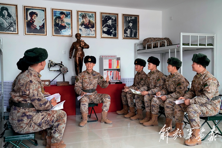 “雷鋒班”戰(zhàn)士在一起交流學習體會。