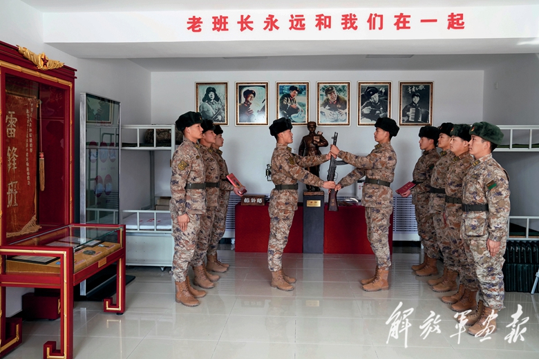 2月16日,“雷鋒班”為新入班戰(zhàn)士蔣佳恒舉行“雷鋒槍”交接儀式。