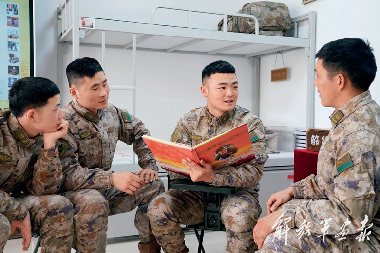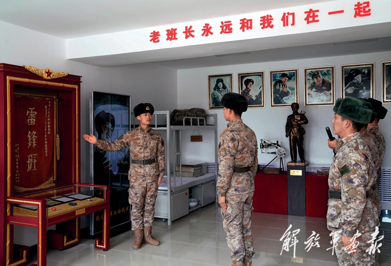 “雷鋒班”班長牟振華(左一)為新入班戰(zhàn)士蔣佳恒講述雷鋒故事。