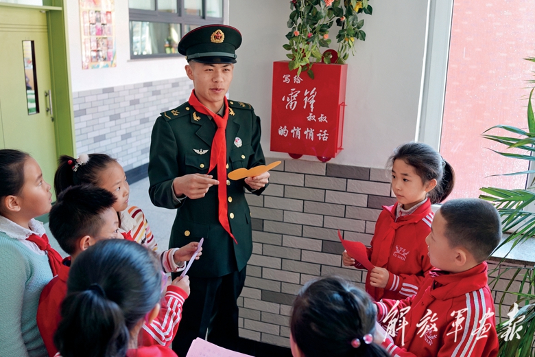 “雷鋒班”戰(zhàn)士以實際行動詮釋和踐行雷鋒精神。圖為2018年,“雷鋒班”第26任班長、校外輔導(dǎo)員張陽為雷鋒小學學生講述雷鋒故事。
