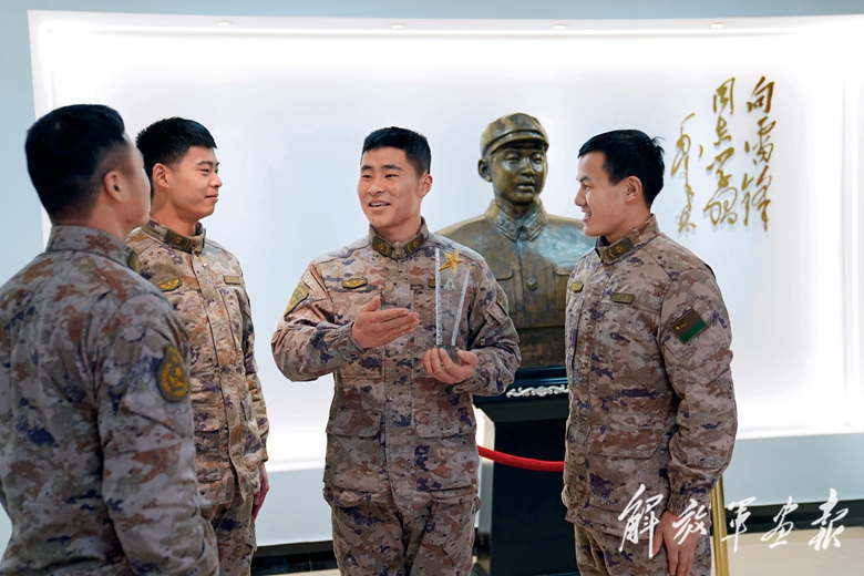 “雷鋒班”戰(zhàn)士姚夢晨(右二)被旅評為“學雷鋒先進個人”,與戰(zhàn)友分享榮光。