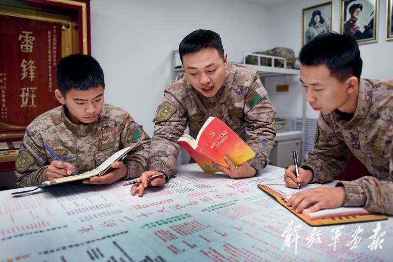 “雷鋒班”副班長葉子貴(中)和戰(zhàn)友一起學習黨的二十大報告。