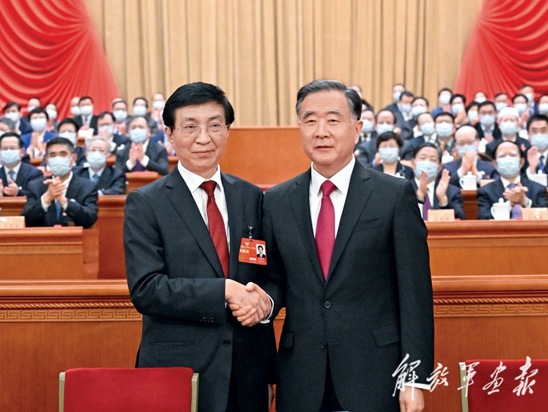 3月10日,全國政協(xié)十四屆一次會議在北京人民大會堂舉行第三次全體會議。當(dāng)會議主持人宣布王滬寧當(dāng)選政協(xié)第十四屆全國委員會主席后,汪洋起立祝賀,與王滬寧熱烈握手。(攝影/新華社記者 李學(xué)仁)