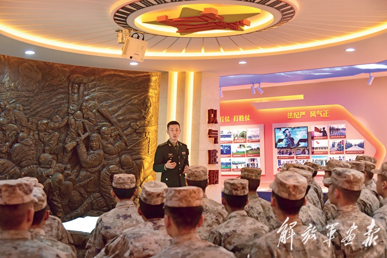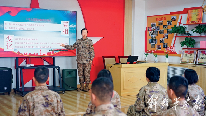兩會(huì)閉幕后,全國(guó)人大代表、陸軍第81集團(tuán)軍某旅“松骨峰特功連”指導(dǎo)員彭陳在連隊(duì)榮譽(yù)室為官兵傳達(dá)全國(guó)兩會(huì)精神。(攝影/姜慧鑫)