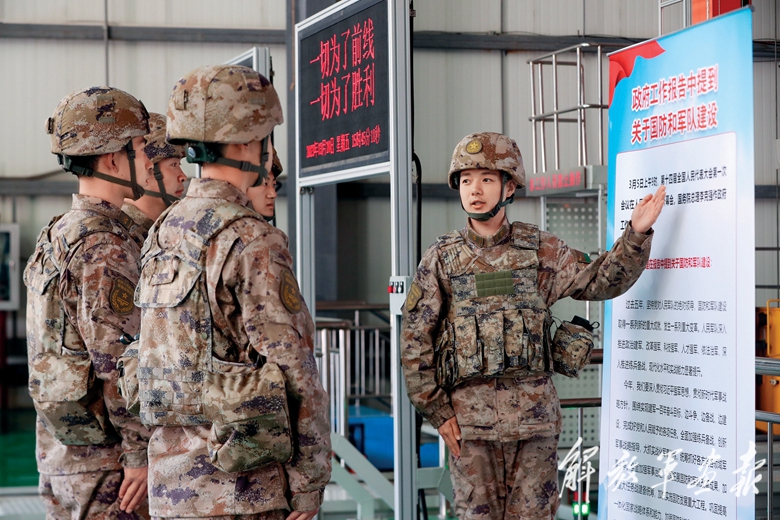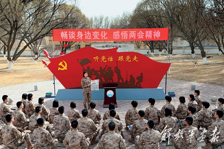 戰(zhàn)略支援部隊(duì)某部官兵暢談身邊變化,感悟全國(guó)兩會(huì)精神。(攝影/蔣中軍)