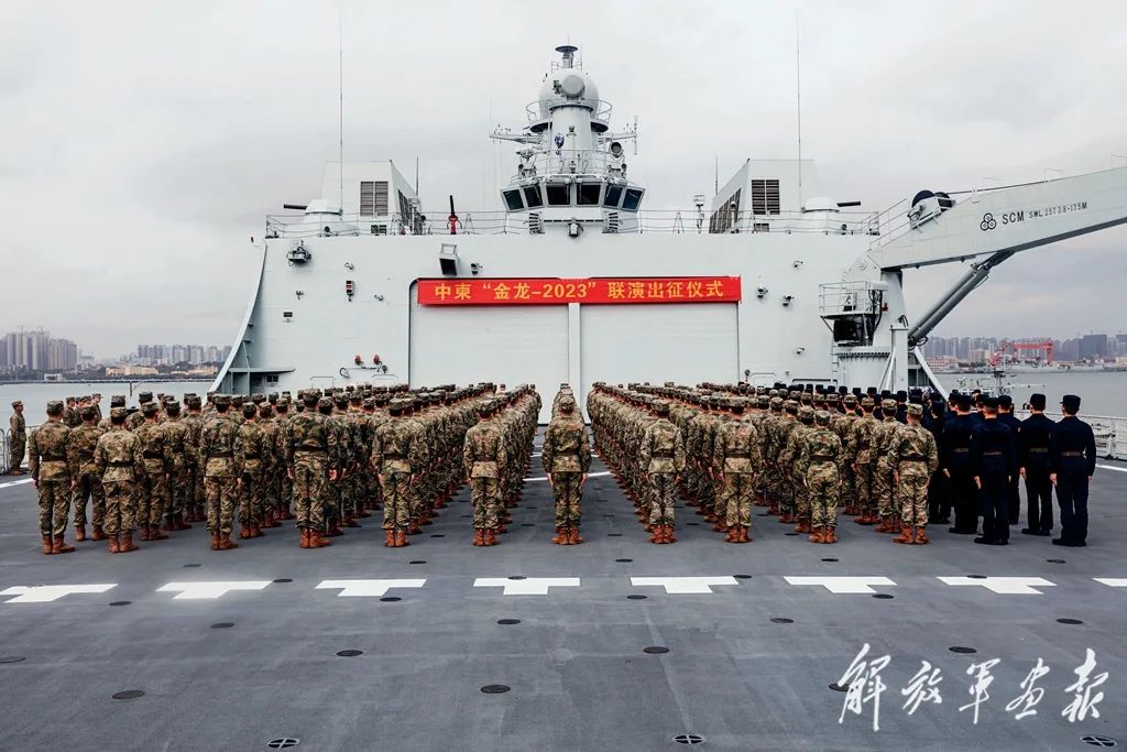 3月15日,中柬“金龍-2023”聯(lián)演中方參演部隊在某軍港碼頭舉行出征儀式。
