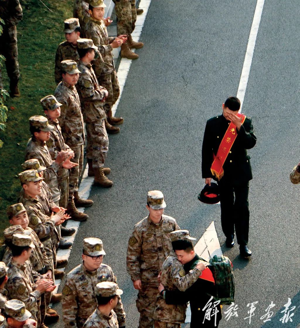 3月7日上午8點14分,前來為退役士兵送行的官兵早已列隊等候。劉書嘉和徐楠杰同其他退役戰(zhàn)士站成一列,集體向送行的戰(zhàn)友敬軍禮告別。