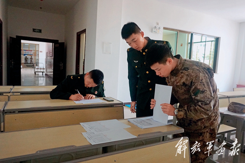 3月6日上午,劉書嘉(左一)和徐楠杰(中)核對退役信息。