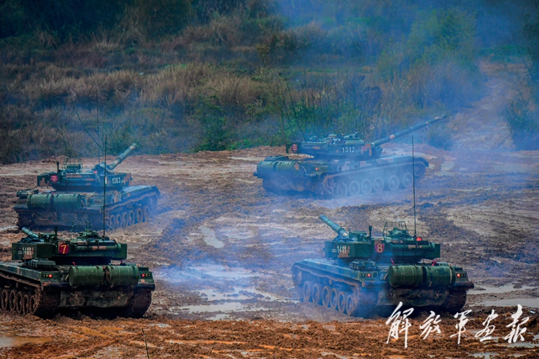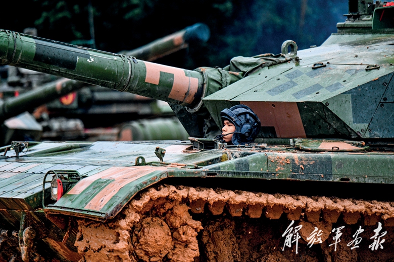 官兵駕駛戰(zhàn)車在泥濘山路上行進。