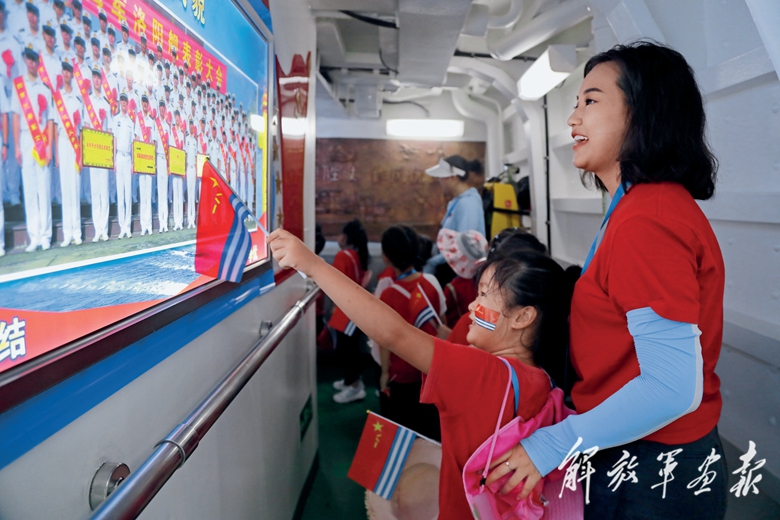 海軍駐三亞部隊舉行艦艇開放日活動。圖為當(dāng)?shù)赜變簣@師生參觀艦艇通道文化。