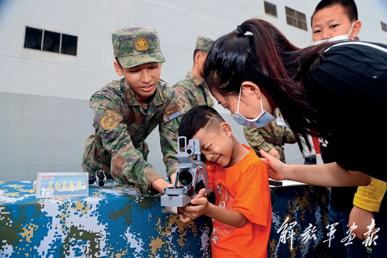 南部戰(zhàn)區(qū)海軍某軍港舉行艦艇開放日活動,一名兒童在昆侖山艦體驗裝備。