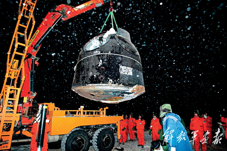 北京時間2003年1月5日,神舟四號飛船在雪夜中順利降落在內(nèi)蒙古中部地區(qū)的著陸場。(攝影/周朝榮)